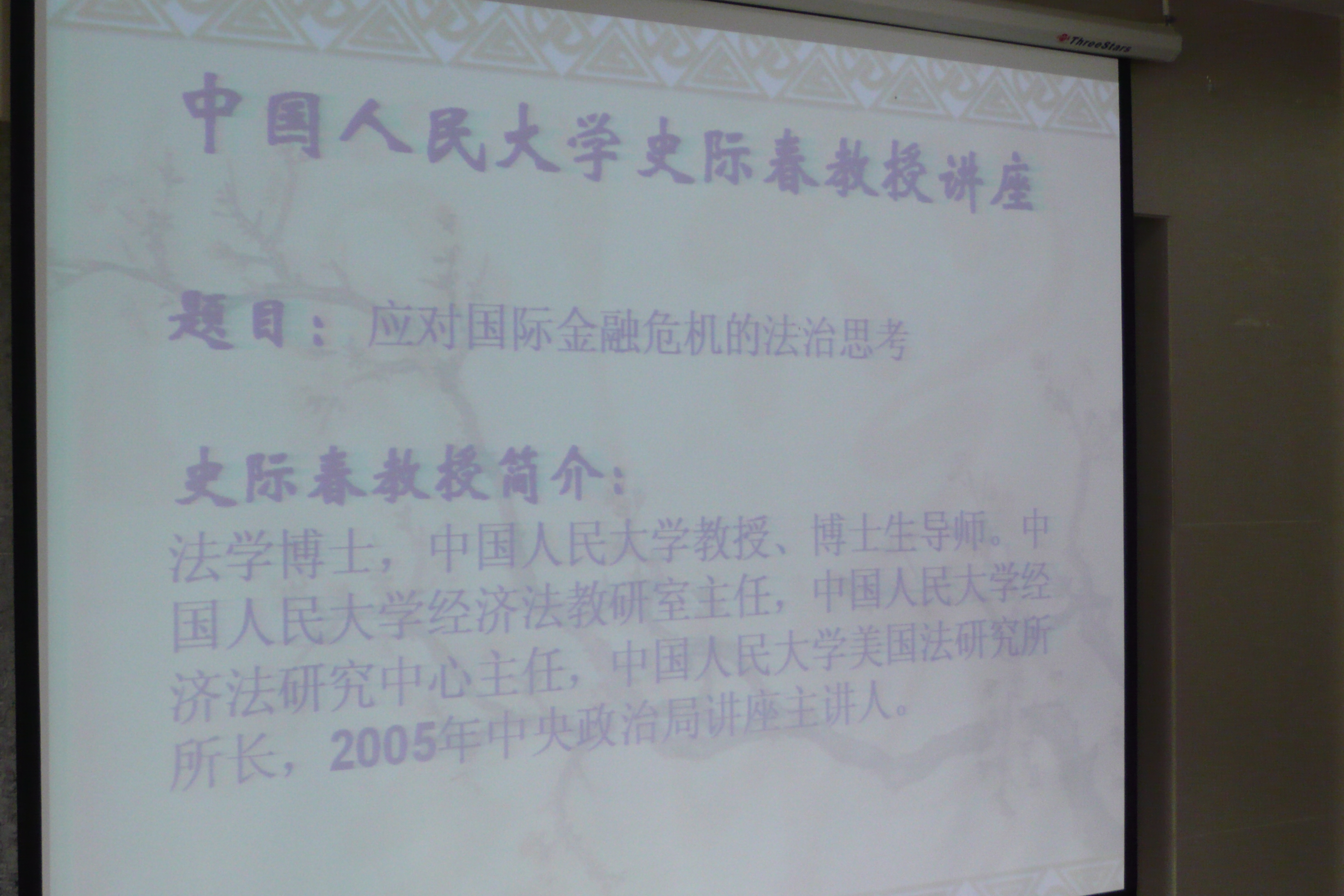 主持人:每年的这个时候,对高校老师来讲,被称之为“黑色五月”。但今天是喜庆的,因为今天我们请来了,学贯中西,经济法学界一代宗师,我国著名经济法学家,中国人民大学法学院史际春教授。史老师在经济法基础理论、消费者权益保护法、政府采购法等经济法制方面卓有建树。同时史老师对武大也非常关心和提携。昨天,法学院学术委员会做出决议,决定向史际春发出邀请,聘请史老师为武汉大学经济法研究所法学院的兼职教授和经济法研究所的兼职研究员。本来,法学院肖永平院长要参加会议,但因临时有事,委托我代表法学院向史际春教授的到来表示热烈的欢迎。同时一并委托我向史老师颁发聘书。今天,史老师在百忙之中来到武大,我们发现武汉大学经济法研究所珞珈山的山更青了,下了多天的雨也不下了。接下来,史老师将奉献给我们一场学术大餐,向我们做 “应对国际金融危机的法治思考”的学术报告,让我们以热烈的掌声,欢迎史际春教授做学术报告。